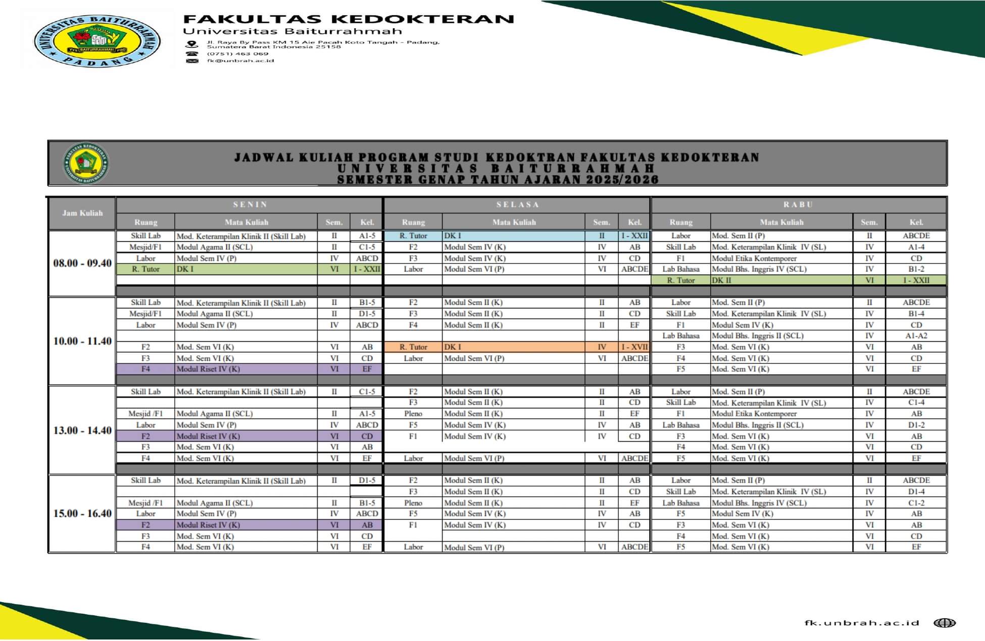 Jadwal Kuliah Progam Studi Kedokteran Fakultas Kedokteran Universitas Baiturrahmah Semester Genap T.A 2025/2026 / Jadwal / Oleh HumasFK Download Jumlah Pengunjung: 34