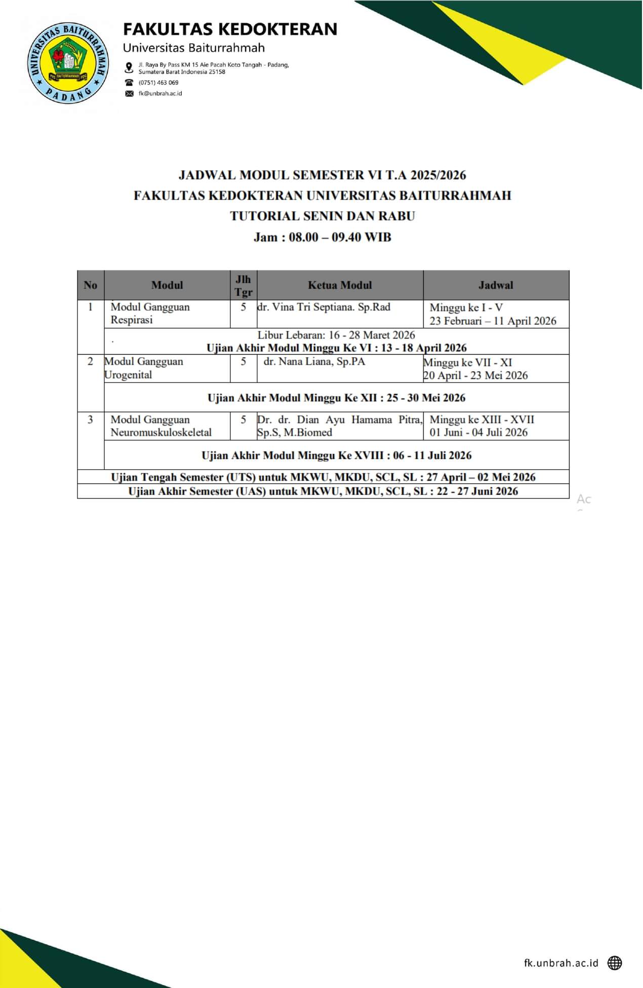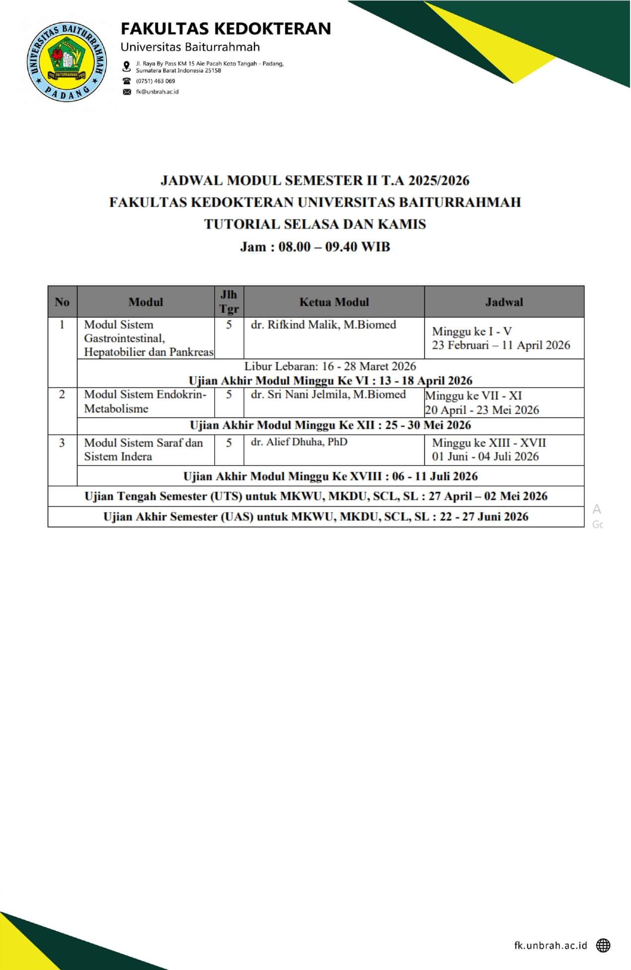 Jadwal Modul Tahun Ajaran 2025/2026 Fakultas Kedokteran Universitas Baiturrahmah / Jadwal / Oleh HumasFK Download Jumlah Pengunjung: 26