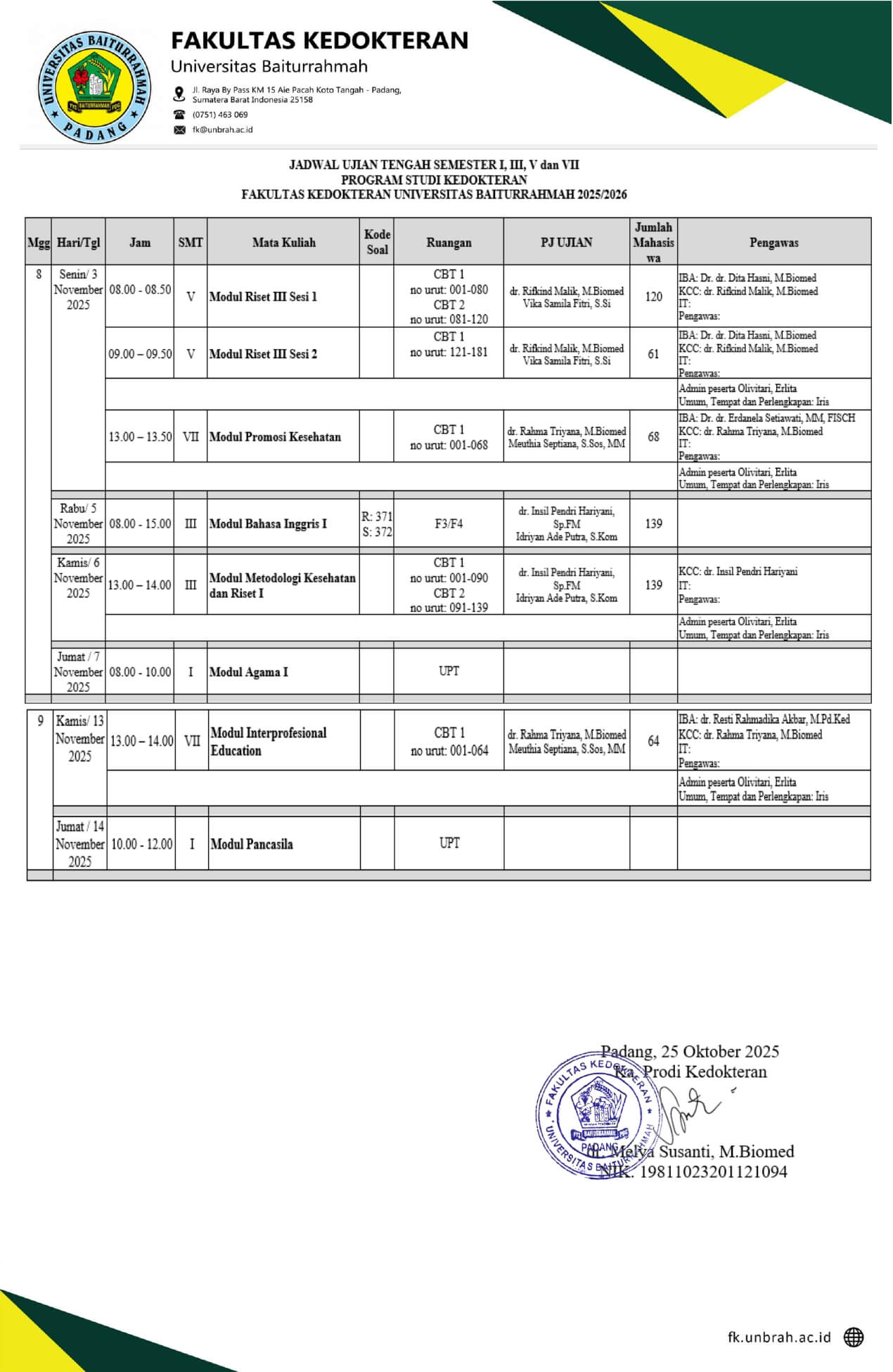 jadwal Ujian Tengah Semester I,III, V dan VII Progam Studi Kedokteran Fakultas Kedokteran Universitas Baiturrahmah / Jadwal / Oleh HumasFK Download Jumlah Pengunjung: 467
