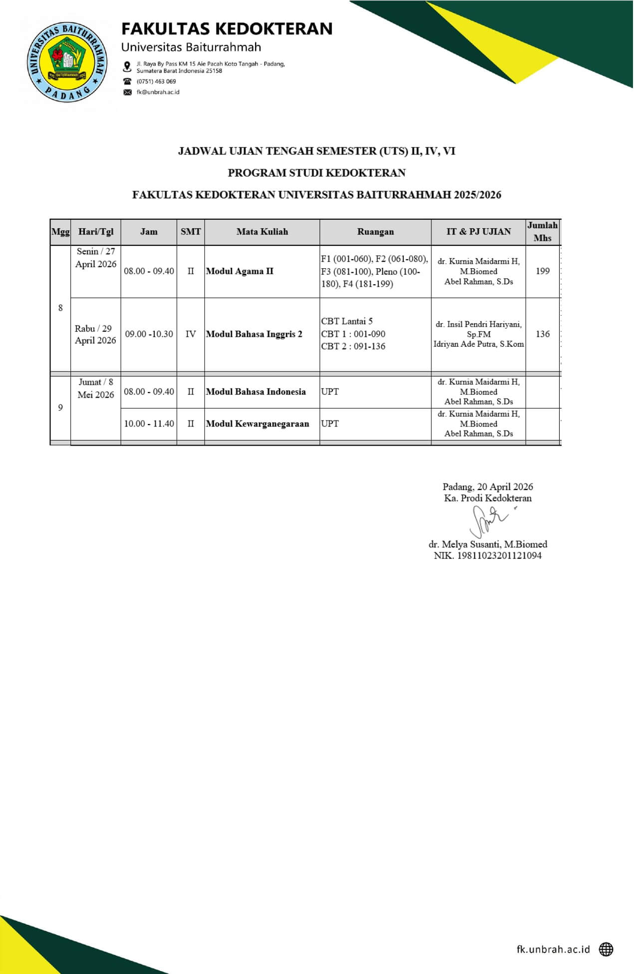 Jadwal Ujian Tengah Semester ( UTS) II, IV, VI Progam Studi Kedokteran Fakultas Kedokteran Universitas Baiturrahmah / Jadwal / Oleh HumasFK Download Jumlah Pengunjung: 146
